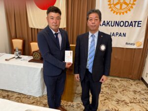 9月17日(水)の例会で、角館マックス野球スポーツ少年団親の会会長 藤原智佳良様に助成金をお渡ししました。マックス招待野球大会の運営費に充当されます。